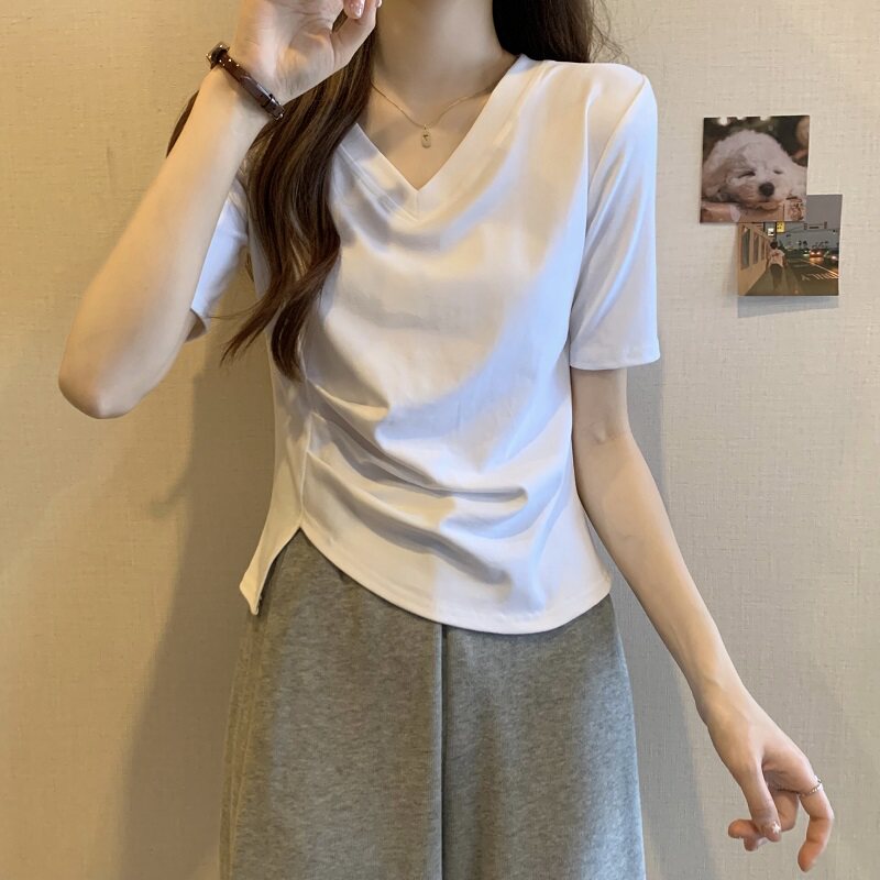 Mùa hè năm 2025 người phụ nữ ngắn ngắn vai áo thun hàn quốc slim V cổ áo thời trang