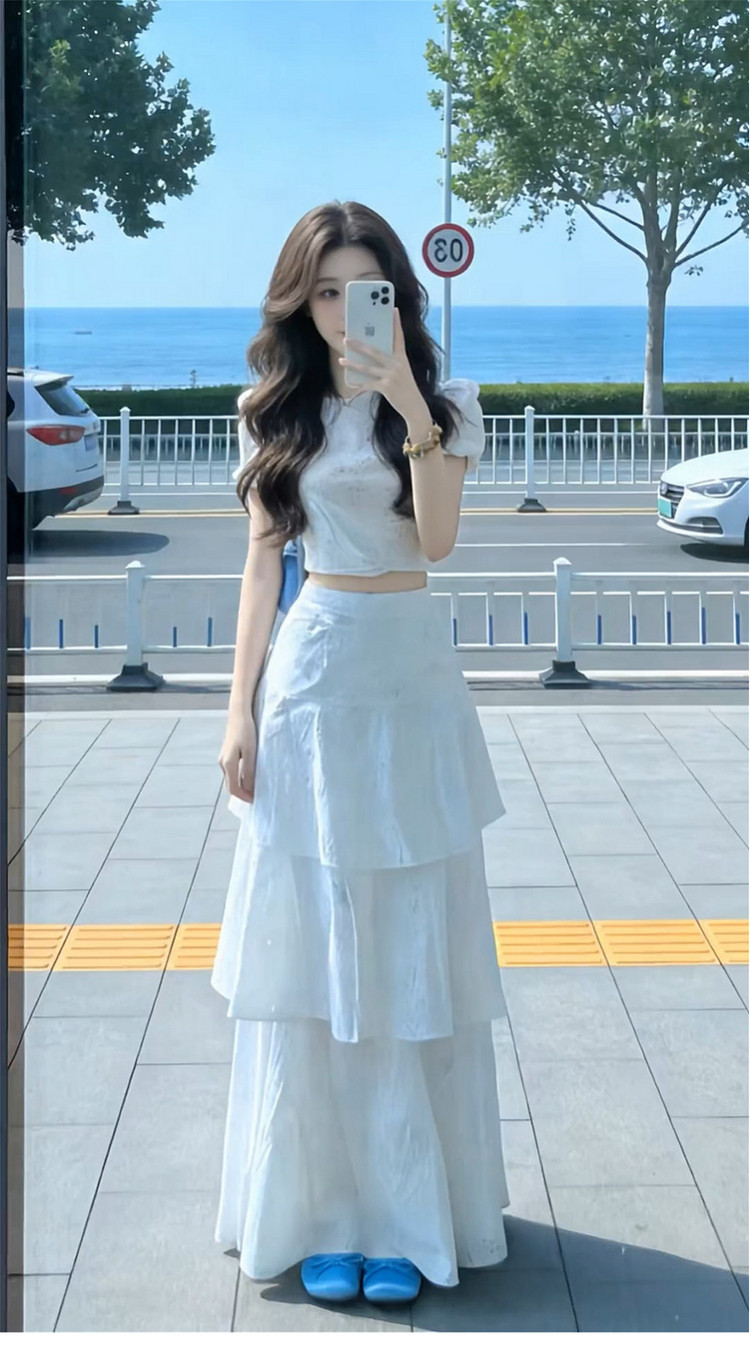 2026 phong cách mới bãi biển nghỉ mát màu trắng ngắn tay phù hợp váy mùa hè Pháp tuyệt đẹp thắt lưng bánh đầm dài
