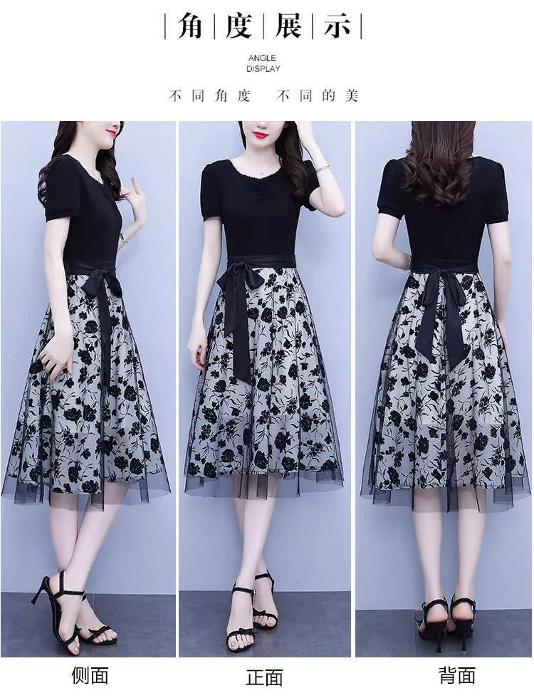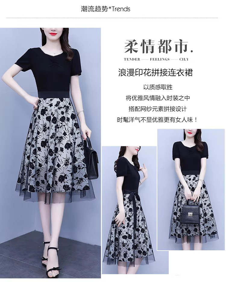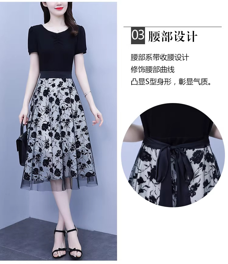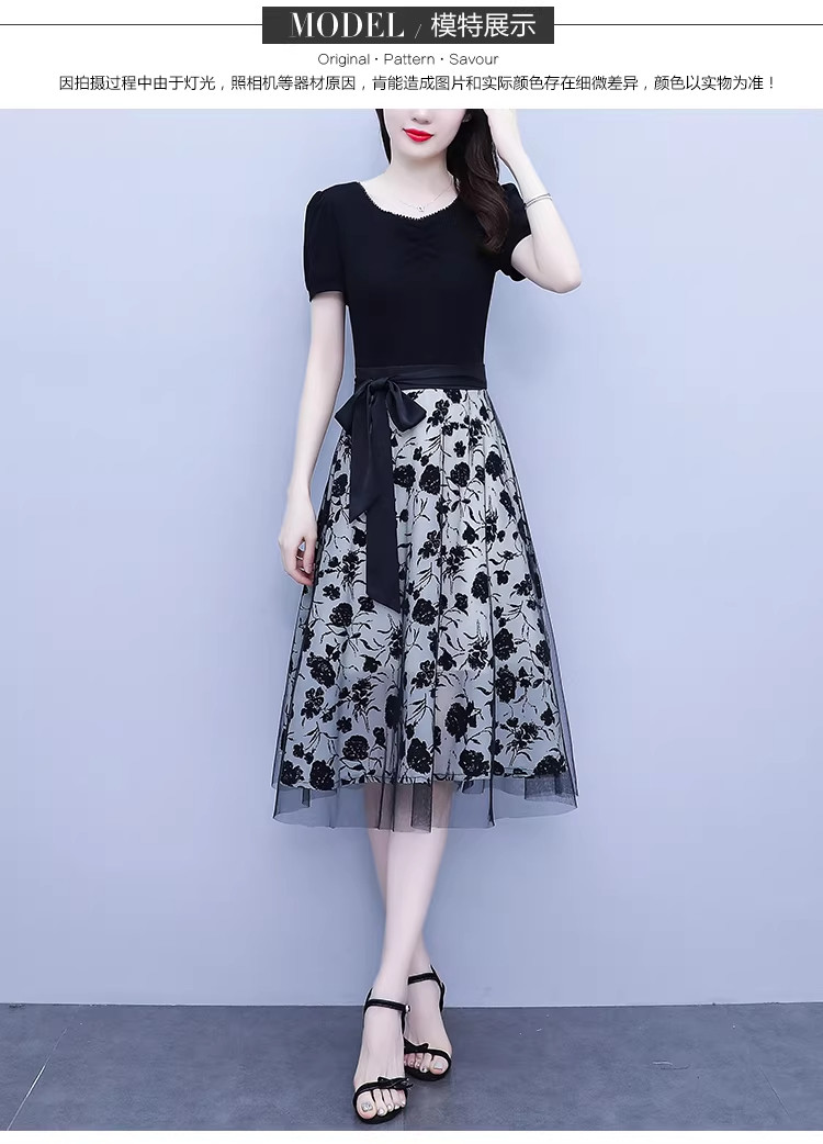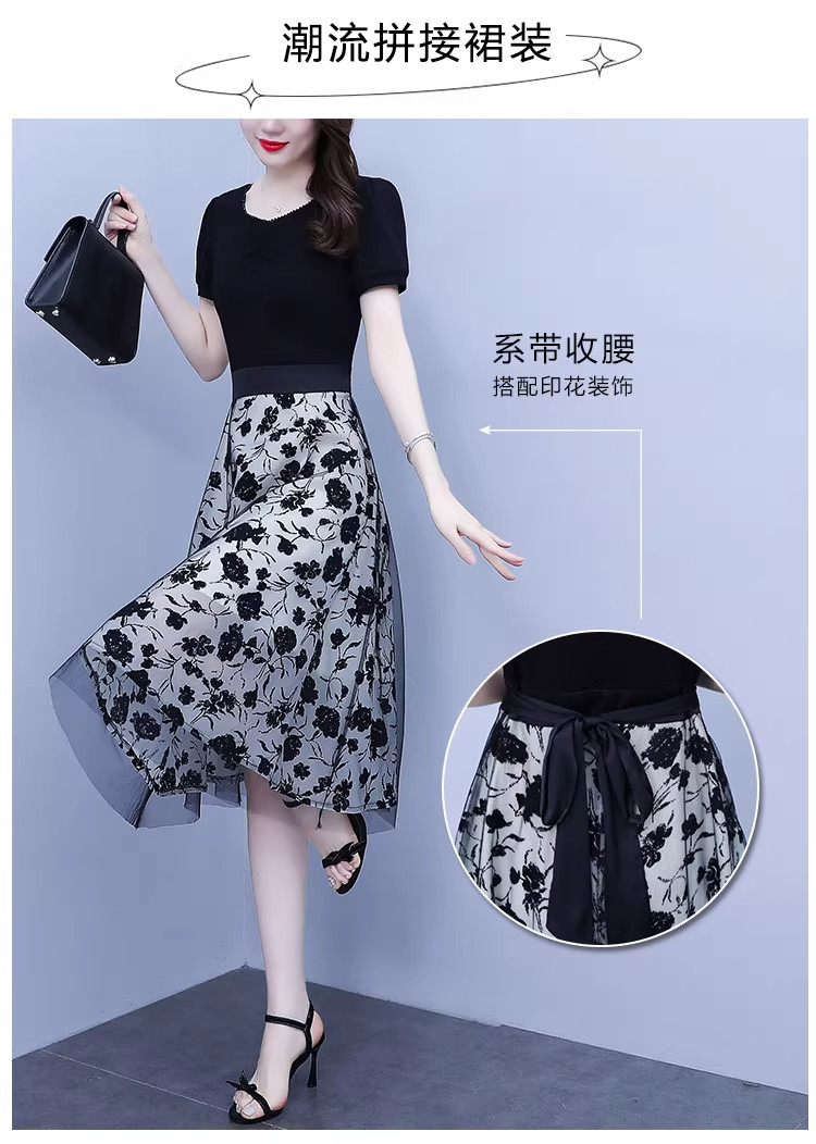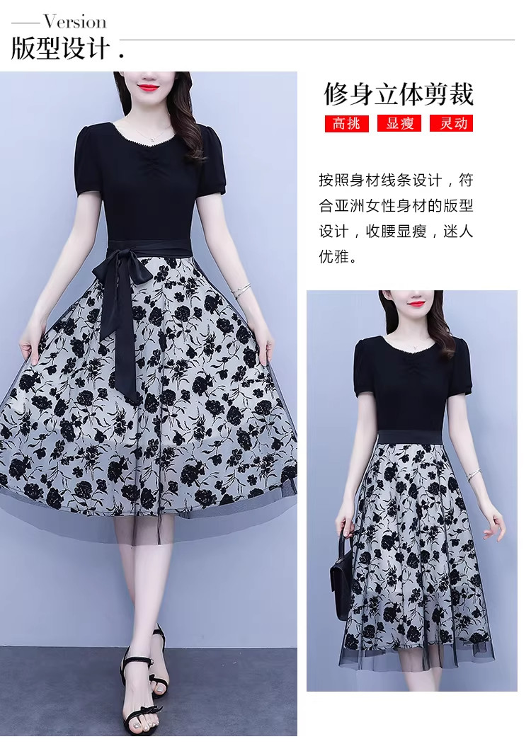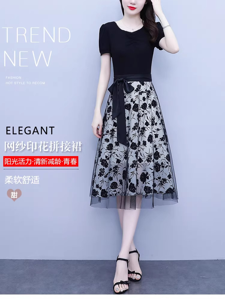 Cao cấp mạng lưới in May hai váy ngắn tay áo nữ mùa hè thu thập thắt lưng mỏng váy dài