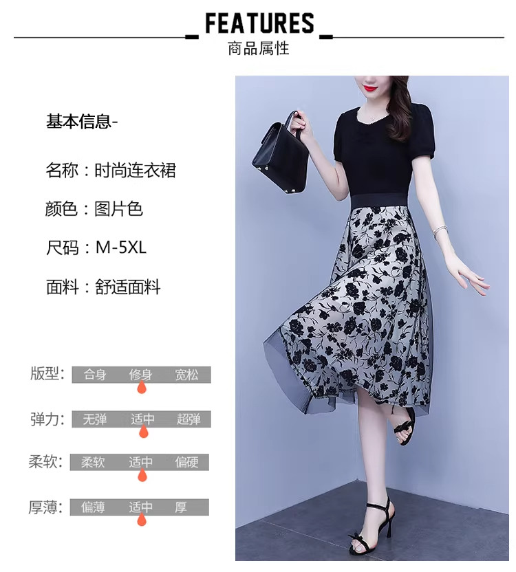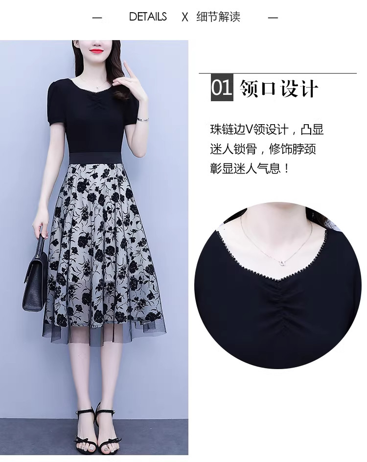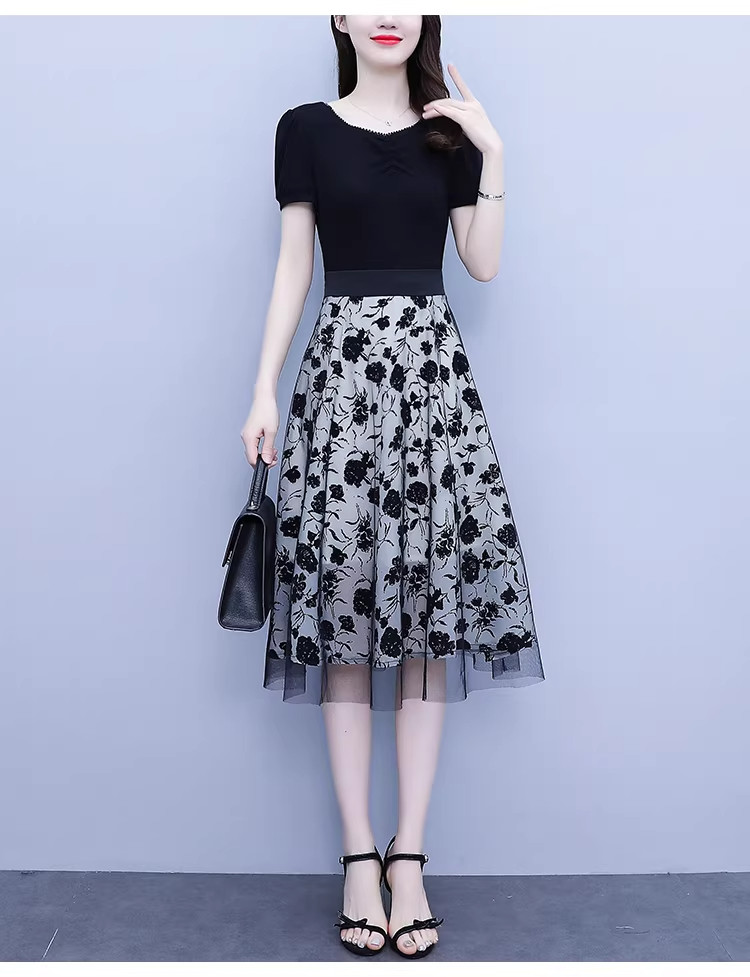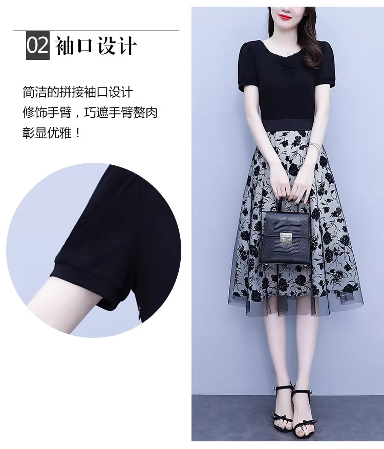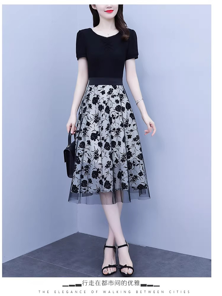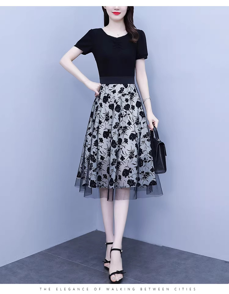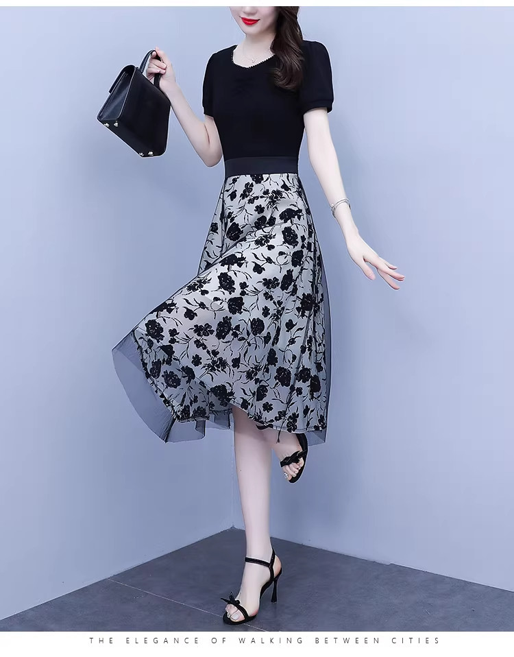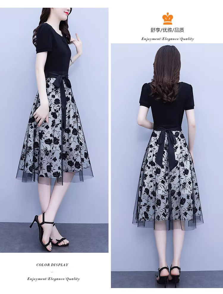 Cao cấp mạng lưới in May hai váy ngắn tay áo nữ mùa hè thu thập thắt lưng mỏng váy dài
