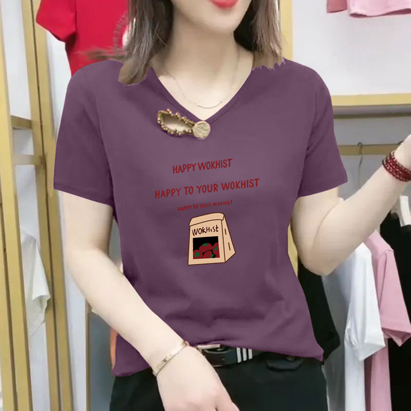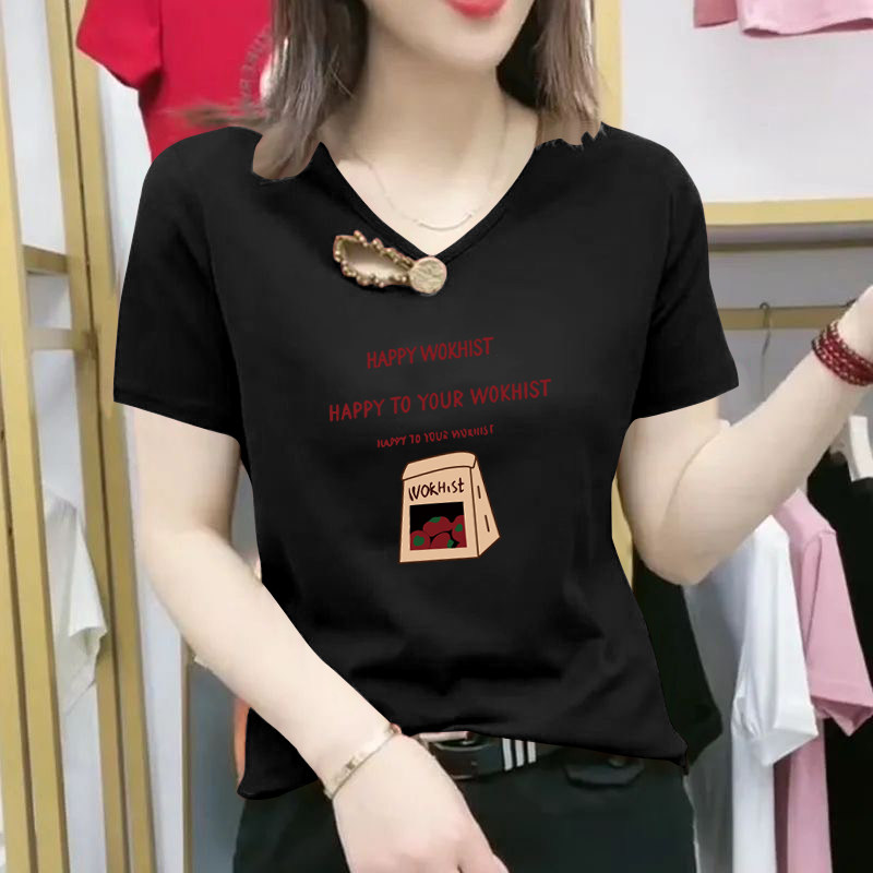 Bông V cổ áo sơ mi ngắn tay mùa hè năm 2025 người phụ nữ mới thư giãn thiết kế khố in áo