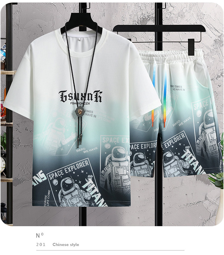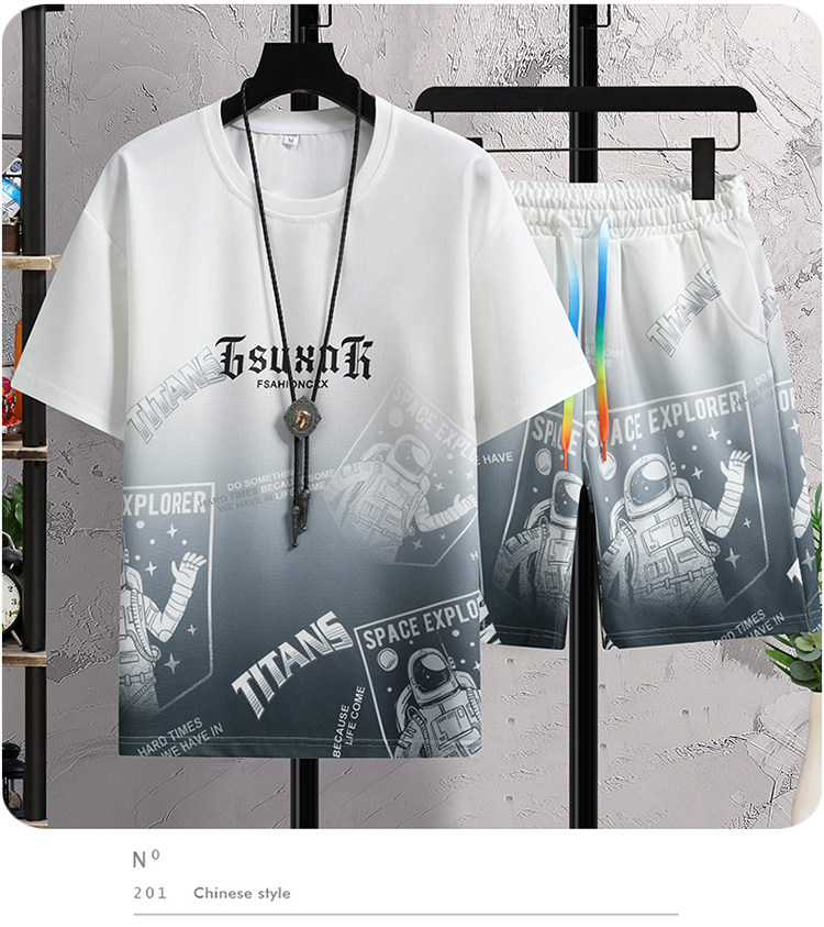 Thể thao giản dị phù hợp với nam giới mùa hè 2025 phong cách mới với thanh thiếu niên đẹp trai mùa hè phù hợp với băng lụa ngắn tay áo+quần short